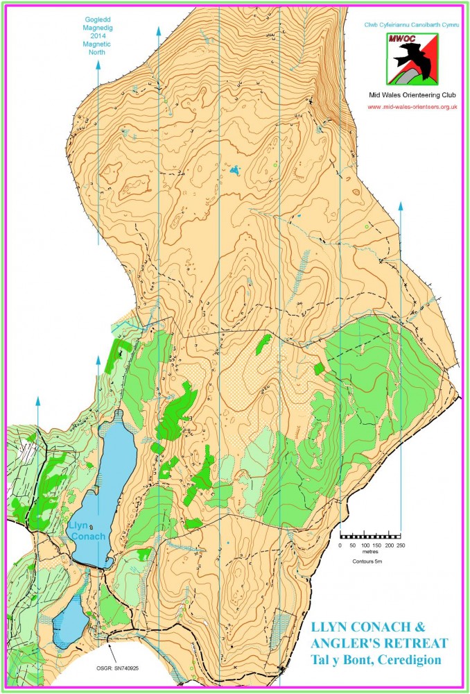 There are plenty of contour features and a scattering of crags throughout. The northern section is completely open. It has not been well grazed and so is rough, this will give mostly slow running. The middle section is mostly slow run forest and open. It encompasses Llyn Conach and the smaller Llyn Dwfn. The smaller Southern open area is well grazed and fast running.